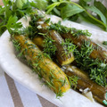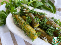 Готовим заливку-маринад: смешиваем сок лимона, чеснок, мед и оливковое масло. Мед можно заменить сахаром. В емкость, удобную для хранения в холодильнике, кладем кабачки и заливаем маринадом. Накрываем крышкой и убираем в холодильник не менее, чем на 6 часов. При подаче посыпаем укропом.