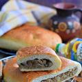 Слепить края теста, формируя таким образом пирог. Шов тщательно защипить. Сделать несколько отверстий в пироге, чтобы во время выпекания из пирога мог свободно выходить пар. Таким же образом поступить со второй частью теста. Можно, конечно, приготовить один большой пирог. Можно 4-6 маленьких.