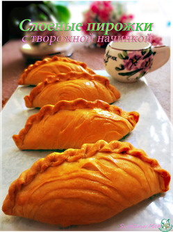 Сложить лист один на другой. Свернуть листы в рулет. Разрезать на 12 одинаковых частей. Каждый кусочек теста раскатать в круглую лепешку, при этом очень слабо надавливая скалкой. Диаметр лепешки примерно 12-14 см, толщина 2 мм. Лепешку перевернуть и в серединку положить 1 или 1.5 ст. л. начинки (для начинки смешиваем творог со сливками, сахаром и хорошо перемешиваем). Залепить края лепешки, как на вареники и затем еще раз по методу витой веревочки.