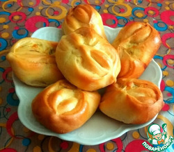 Подошедшее тесто обмять. Раскатать в пласт толщиной 2-3 мм. Стаканом вырезать круги. На круги теста выложить начинку. Соединить противоположные стороны круга к центру, а затем точно также боковые, чтоб получилось 4 краешка. Соединить 2 краешка вместе с двух сторон.