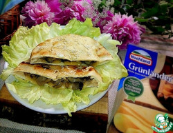В каждую половинку питы вкладываем кусочки сыра и добавляем грибную начинку. Каждую половинку сверху я намазала сливочным маслом, присыпала кунжутом и прогрела на гриле до легкого румянца. Все это Вы можете заранее сделать дома и взять готовые питы на природу, или начинять и немного запекать прямо на пикнике.