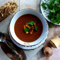 Разливаем по тарелкам. В центр выкладываем овощи с нутом и украшаем листиками кинзы или другой зеленью. Полезный ароматный суп-пюре с насыщенным томатным и пряным вкусом!