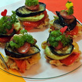 На каждую овсяную вафлю выложить овощи-гриль, шпикачки. Проткнуть шпажкой для устойчивости. Украсить зеленью. Можно подать соус "Цахтон": в сметану всыпать сухую аджику, добавить тертый чеснок, мелко нарезанную зелень кинзы и петрушки. Посолить, поперчить.