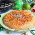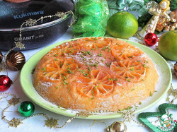Снять ручку со сковороды, накрыть большой тарелкой или блюдом для подачи и аккуратно перевернуть пирог (не забудьте использовать защитные прихватки, сковорода очень горячая). Дать остыть пирогу. Перед подачей посыпать пирог сахарной пудрой, корицей и цедрой мандарина.