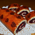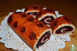 Готовый бисквит переложить на бумагу, убрать пергамент, на котором он выпекался. И скрутить рулет вместе с бумагой. Когда рулет остынет, развернуть его, распределить варенье ровным слоем и опять скрутить.