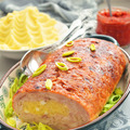 Приготовьте глазурь, смешав кетчуп и соевый соус. Кисточкой обмажьте рулет сверху. Верните его в духовку, поднимите температуру до 200°С и подрумяньте рулет. Готовый рулет, выньте из духовки, накройте фольгой и дайте ему постоять 15-20 минут. Затем нарезайте на кусочки и подавайте.