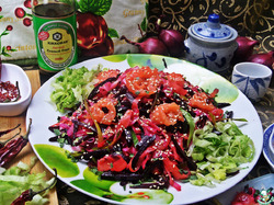 Рисовую лапшу согласно инструкции проварить 2-3 минуты. Процедить. Выложить в миску, добавить свёклу. Морковь с чесночком. Оба вида лука. Перемешать. Добавить засоленную рыбку. Для заправки настричь мелко перец чили. Залить имбирь и чили оливковым маслом и яблочным уксусом. Влить соевый соус. Добавить тимьян и растёртый кориандр. Смешать и вылить на салат. Смешать. Выложить горкой на блюдо. Салат Айсберг нашинковать. И подать рядом. Верх украсить рыбными розочками и жареным кунжутом. Кушать тут же.
