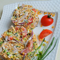 Дать 30 минут салату постоять, затем убрав кольца, подавать.
