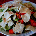 Фишка этого салата - подсушенный хлеб. Хлеб подсушить любым доступным способом и наломать на кусочки (я нарезала лаваш на квадратики).