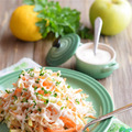 Смешать йогурт, нежирную сметану, столовый хрен, лимонный сок и горчицу (готовую). Пропорции заправки - дело вкуса. Сразу все предложенное количество ингредиентов (хрен, горчица, лимонный сок) добавлять не стоит. Лучше попробовать заправку и отрегулировать ее по своему вкусу, положить чего-то больше или меньше. Посолить опять же на свой вкус.