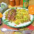 Раскалить чугунную сковороду гриль. Налить масло. Положить в горячее масло стейк, слегка прижать. Перевернуть и жарить, не сдвигая, снизу. Всего 10 минут обе стороны. Перенести на тарелку, рядом переложить картофельные ломтики. Высыпать сверху со сковороды порей. Стейк полить соевым соусом. Тут же подаём.