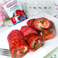 Блин положила на разделочную доску и намазала сыром. Нарезала укроп и посыпала им сыр. Лосось положила с одного края. (Лосось солила - морская соль, сахар, измельчённые стебли свежего укропа. Лосось в меру солёный и очень ароматный). Блины мягкие и хорошо сворачиваются в рулеты. Блинные рулеты в разрезе.