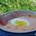 Когда суп охладится, разлить по тарелкам. Подавать холодным, украсить ломтиком Хамона и кусочками вареного яйца, сбрызнуть оливковым маслом. Приятного аппетита! Хорошей погоды!!