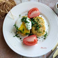 Подаём. Для подачи я ещё присыплю верх блюда порезанной зеленью: укропом и петрушкой и положу помидор свежий. Надсекаем яйцо-пашот и едим! Это очень вкусно!