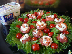 Слабосоленую форель нарезать длинными полосками, а затем сверху смазать плавленым сливочным сыром. На блюдо выложите листья салата, затем разрезанные пополам помидоры черри. Ломтики форели скрутите в рулетики и выложите на листья салата между помидорами черри.