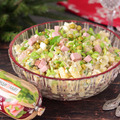 Возьмите самую глубокую миску. И все ингредиенты по мере нарезания укладывайте в миску слоями, не перемешивая. Те ингредиенты, которые выделяют сок (горошек и огурцы) - на самое дно. А остальные ингредиенты сверху. Так, сок от горошка и огурцов останется на дне миски и не будет пропитывать все остальные ингредиенты. Таким образом, салат дольше сохранится в холодильнике без заправки. На дно миски выложите зелёный горошек, предварительно слив с него жидкость. Горошек выбирайте мозговых сортов, он самый нежный и вкусный. Не используйте для салата консервированный горошек, приготовленный из сухого - такой горошек очень жёсткий и испортит вам и салат, и новогоднее настроение.