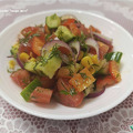 Мелко нарезать огурец, перец болгарский, кубиками помидор и выложить всё в салатницу вместе с нарезанным полукольцами красным луком.