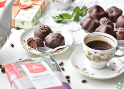 Оставшийся шоколад и кокосовое масло растопить, размешать до гладкой и блестящей массы. Каждую конфету извлечь из формы и окунуть в шоколадную глазурь. Из данного количества получается 20 конфет.