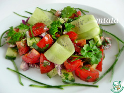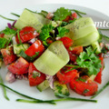 Салат разложить по тарелкам. Украсить по своему усмотрению. Я натерла огурец на китайской терке узкие полоски, а овощечисткой широкие ленточки.