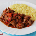 Болгарский перец помыть, почистить, нарезать кубиками и добавить к мясу, перемешать и тушить ещё 30 минут. Пёркёльт готов.