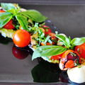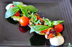 Разрежьте помидоры черри пополам (можете оставить пару штук для украшения). Разрежьте шарики моцареллы пополам. Несколько листиков базилика оставьте для украшения, остальные сверните трубочкой и мелко нарежьте. Приготовьте бальзамический соус, для этого смешайте бальзамический уксус и мед и поставьте на медленный огонь. Как только жидкость начнет густеть - Ваш соус готов. На тарелку выложите соус песто, добавьте томаты и моцареллу, посыпьте базиликом, после этого полейте бальзамическим соусом и украсьте листиками базилика. Приятного аппетита!