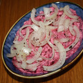 Время приготовления у меня дано без учета готовки свеклы. Итак нам понадобится... вареная свекла, йогурт и мята. Нарезать лук полукольцами и замариновать его в лимонном соке. По вкусу сыпем сумах, он придаст дополнительную кислинку. Маринуем около 15 минут. Нарезаем мелко мяту.