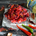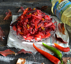 Заранее сварить или запечь свёклу, картофель и морковь. Полностью остудить и почистить. Нарезать свёклу тонкими брусочками, сбрызнуть растительным маслом. Подобным образом нарезать картофель и морковь. Добавить к свекле.