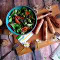 Заправляем салат, присыплем любой зеленью и сразу же подаём, чтобы листики салата остались хрустящими. Салат нужно заправить перед подачей! Купаты тоже "поспели".