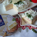 Последний слой - из крабовых палочек два развернутых листа (но только оставьте белую часть палочек). Смажьте верх и бока тортика тонким слоем майонеза.