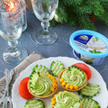 В готовые формочки для порционных салатов добавить кусочки куриного филе, при помощи кондитерского мешка с насадкой, сверху добавить крем из авокадо и творожного сыра. Свежий огурчик нарезать ломтиками, выложить на крем из авокадо, сверху конструкцию присыпать кунжутом, украсить сладкой кукурузой.