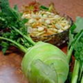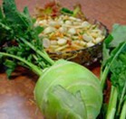 4 маленькие головки кольраби 0,5 пучка редиса 2 моркови 2 яйца 2 стебля зеленого лука 1 ст.л. мелко нарезанной мяты 4 ст.л. нарезанной петрушки 2 ст.л. растительного масла Соль Кольраби очистить и натереть на крупной терке, редис нарезать кружочками, морковь натереть на терке. Белки сваренных вкрутую яиц мелко порубить. Все смешать, посолить, добавить мяту, петрушку и мелко нарезанный лук. Желтки натереть на мелкой терке, смешать с маслом и заправить салат.