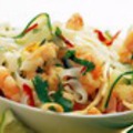 12 сырых очищенных креветок 6 ст.л. растительного масла 3 зубчика чеснока Соль, перец 2 зеленых сладких перцев 6 помидор 40 г макарон-ракушек сок 1/2 лимона 12 стручков маринованного острого перца Молотый красный перец Креветки вымыть и обсушить, обжарить их в сковороде в масле 3-5 мин. Чеснок очистить и нарезать кружочками, добавить к креветкам и быстро все обжарить, посолить поперчить по вкусу. Перец вымыть в горячей воде и мелко порезать. Вскипятить в кастрюле воду, посолить ее и отварить в ней макароны, сварить, не разваривая и откинуть на дуршлаг, обдать холодной водой. Креветки смешать с макаронами, сладким перцем и помидорами (крупно нарезанными кубиками) и лимонным соком. Посолить, поперчить и приправить красным молотым перцем. Разложить по тарелкам и украсить маринованным перцем.