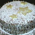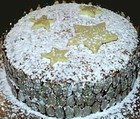 1/2 ч.л. разрыхлителя, по 1 ч.л. порошка какао и растворимого кофе, 4 яйца, 1 щепотка соли, 120 г сахара, по 60 г муки и крахмала Украшение: 3 дольки апельсина, 250 г марципановой массы, 100 г сахарной пудры, 1 ч.л. какао, 1 ч.л. растворимого кофе, 1 ч.л. рубленых орехов Начинка: 1 пакетик ванилина, 4 ст.л. апельсинового джема, 100 г ядер грецких орехов, 600 г сливок В одной ст.л. горячей воды растворить кофе и остудить. Нагреть духовку до 175° С. Белки отделить от желтков, белки взбить с солью и 3 ст.л. холодной воды, всыпать сахар, ввести желтки. Смешать муку, крахмал, какао и разрыхлитель, просеять поверх яичной массы. Заполнить тестом застеленную бумагой форму и выпекать корж 20 мин. Остудить. Взбить сливки с сахаром и ванилином, добавить порубленные орехи. Корж разрезать на 3 части. Разогреть джем и намазать 2 коржа, соединить их, один из коржей намазать половиной орехового крема, накрыть вторым, намазать джемом и сливками, накрыть третьим. Взбить оставшиеся сливки с сахаром и обмазать торт со всех сторон. Ломтики апельсинов обмакнуть в оставшуюся горячую, подсахаренную воду и дать им обсохнуть, выместить марципановую массу с сахарной пудрой между двумя кусками бумаги, раскатать ее по размеру торта. С помощью бумаги накрыть торт марципановой пластиной, прижать, излишки срезать, посыпать какао и вырезать звездочки. Украсить торт кофе, звездочками, цукатами, орехами.