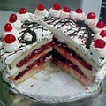 Тесто: 4 желтка, 150 г сахара, соль, цедра 1 лимона, 4 белка, 100 г крахмала, 100 г муки Крем: 1 стручок ванили, 250 мл молока, 250 г сливочного масла, 2 ст. сахара, 4 ст.л. вишневого ликера, 200 г апельсинового конфитюра Украшение: 50 г миндаля, 6 половинок засахаренных ломтиков апельсина, шоколад для глазури, 12 вишен Взбить желтки с 4 ст.л. горячей воды, добавить 100 г сахара и цедру. Нагреть духовку до 200°С. Взбить белки с оставшимся сахаром, выложить на желтки, просеять сверху крахмал, муку и перемешать. Смазать форму жиром, заполнить тестом и выпекать 40 мин. Остудить. Ваниль надсечь, положить в молоко и довести до кипения. Ваниль удалить. Крахмал смешать с водой и, помешивая влить молоко, дать загустеть и остудить на холодной водяной бане. Взбить масло с сахаром, по ложке добавляя молочную массу и ликер. Бисквит разрезать на 3 коржа, 2 из них смазать половиной конфитюра, положить один на другой, накрыв сверху третьим. Половиной крема обмазать торт. Выдавить сверху 12 розочек, обсыпать торт миндалем. Апельсиновые ломтики разрезать пополам, обмакнуть в растопленный шоколад и дать ему застыть, разложить перед розочками. На розочки выложить вишню и в холодильник.