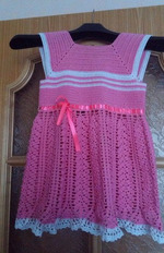 Пример, идея. Пряжа хлопок, № крючка 1.5, размер 48, длина 100 см Декольте оформлено ажурными мотивами, низ ажурной юбки оформлен фестонами связанными крючком. |