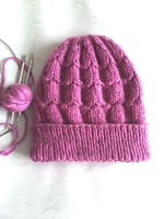Связала простую шапочку спицами. Пряжа ангора РАМ и акриловая (марку не помню), Вязала в три нити, две акриловых и одна ангора. Спицы круговые №4,5.узор колокольчики