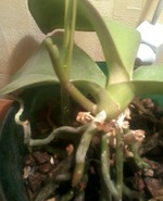 Ну, дождалась я праздника: отрастив третий лист, мой многострадальный фалик выпустил несколько молодых воздушных корней и под занавес - показал клювик цветоноса. К сентябрю будут цветочки...