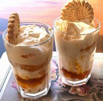 1 кружка ванильного мороженого варенье любое печенье или вафелька 1. сливки взбить. 2. в стаканы выложить слоями мороженое, варенье, взбитые сливки. 3. украсить вафелькой или печеньем |
