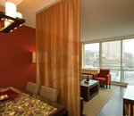 Неоценимое преимущество шторы для разделения комнаты – ее мобильность. Это вам не стеллаж или жалюзи. Штору можно снять, если пришло большое количество гостей и надо поставить большой стол. (Хотя сейчас дома редко принимают много гостей, с ними чаще идут в кафе, ресторан). К тому же штору всегда можно снять, постирать. Это удобно.