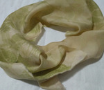 В прошлом мастер-классе "Экопринт на шелке" мы красили шелковый шарфик растениями (листьями, травами) без применения каких-либо протрав и химикатов, лишь обработали шелк белым столовым уксусом. Отпечатки растений получились отчетливые, не очень яркие, зеленого цвета, так как применялись растения только зеленые.