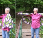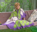 Идея использования разноцветных ромбов в круглом полотне продолжена в шали. Из четырех ромбов связанных узором «простая плетенка» сделана серединка, далее полотно расширяется цветными ярусами из ромбов простой плетенкой и рядов столбиков без накида до необходимого размера. При вязании небольших элементов вместо длинного крючка использован обычный короткий.