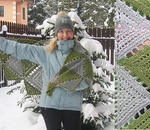При кажущейся простоте филейная сетка неисчерпаема. Ей подвластно огромное количество узоров для вышивки крестом, да и почти любой графический узор несложно переделать на рисунок в клеточку. Использование возможностей отделки по сетке сделает вещь совсем уникальной. Полотно этой шали связано с изменением направления вязания по середине. По контуру листья и бабочка обвязаны темной нитью столбиками без накида.